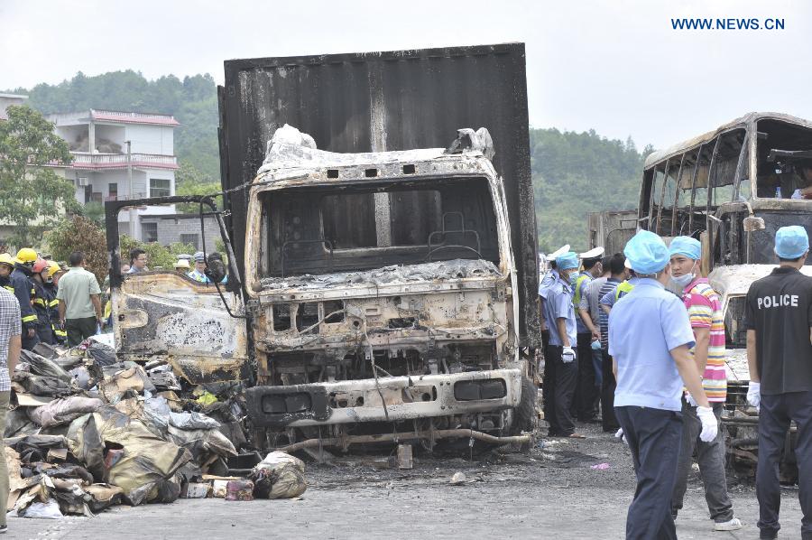 Resucers work at the site of a traffic accident on a section of the Hukun (Shanghai to Kunming) Expressway in central China's Hunan Province, July 19, 2014. At least 38 people are confirmed dead and another five injured after a vehicle crash triggered fire and explosion on the highway early Saturday morning, police said. (Xinhua/Long Hongtao)