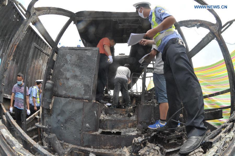 Resucers work at the site of a traffic accident on a section of the Hukun (Shanghai to Kunming) Expressway in central China's Hunan Province, July 19, 2014. At least 38 people are confirmed dead and another five injured after a vehicle crash triggered fire and explosion on the highway early Saturday morning, police said. (Xinhua/Long Hongtao)