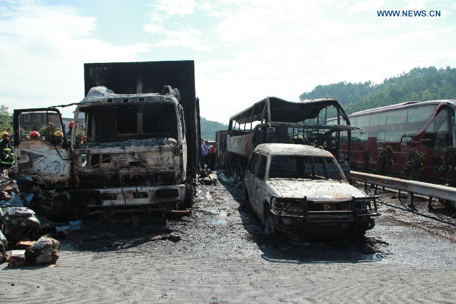 CHANGSHA, July 19 -- At least 38 people are confirmed dead and another five injured after a vehicle crash triggered fire and explosion on a central China highway early Saturday morning, police said.