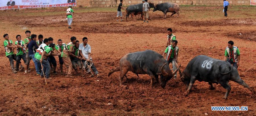 Chinese Bullfights are held during the Torch Festival of Yi ethnic group in Yi Autonomous County of Shilin, southwest China's Yunnan Province, on July 19,2014 (Source: xinhuanet.com)