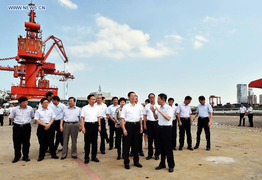 Chinese Vice Premier Zhang Gaoli (C), also a member of the Standing Committee of the Political Bureau of the Communist Party of China Central Committee, visits Quanzhou Harbour Group in Quanzhou, southeast China's Fujian Province, July 17, 2014. Zhang Gaoli made an inspection tour in Fujian Province from July 17 to 19. (Xinhua/Li Tao)