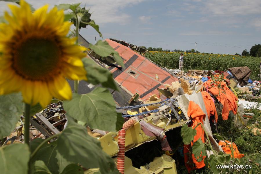 Photo taken on July 20, 2014 shows the debris at the crash site of MH17 of Malaysian Airlines in Ukraine's Donetsk region. Some 198 bodies recovered from the Malaysian airliner crash site have been loaded onto refrigerated train carriages bound for a city in eastern Ukraine, the RIA Novosti news agency reported on Sunday. (Xinhua/Alexander Ermochenko)