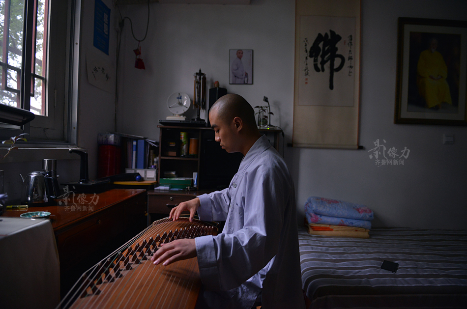 A monk plays Zheng at his room. (Photo/Iqilu.com)