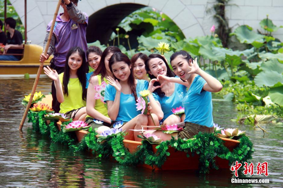 Ambassadors of Zhujiang city boat on a lake and put the floating Lotus lanterns on the water. 20 beautiful ambassadors of Zhujiang city attended the activities held in Lotus World in Foshan, south China's Guangdong province on July 20, 2014. (Photo/CNS)