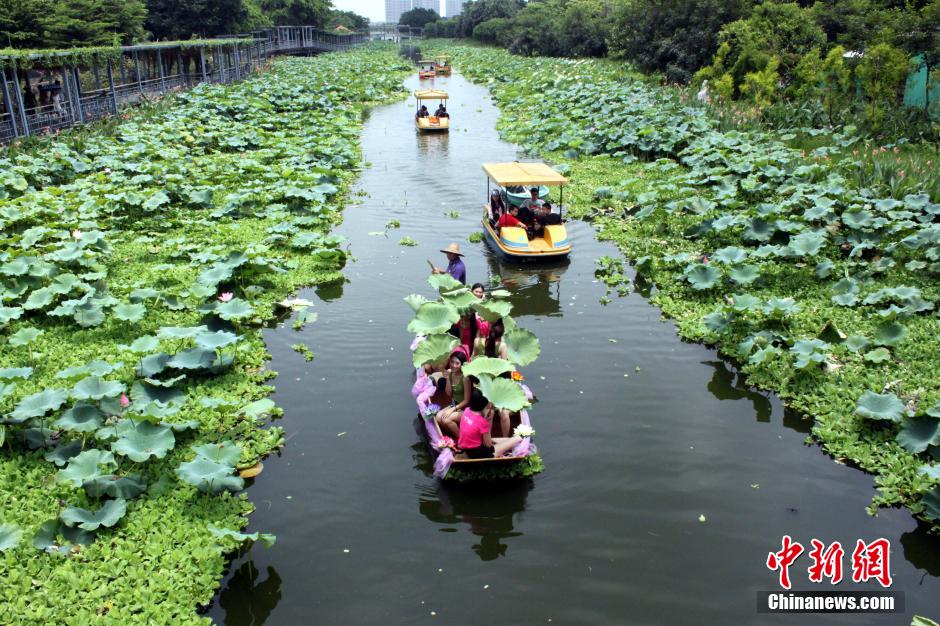 | Ambassadors of Zhujiang city boat on a lake and put the floating Lotus lanterns on the water. 20 beautiful ambassadors of Zhujiang city attended the activities held in Lotus World in Foshan, south China's Guangdong province on July 20, 2014. (Photo/CNS) |