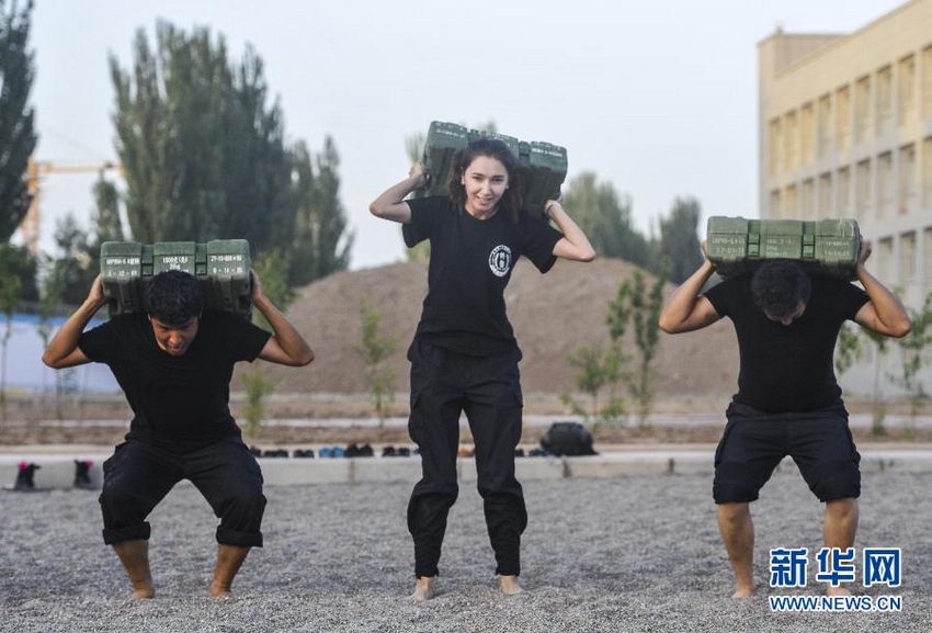 Dilreba Yaqup does physical training with her male colleagues. (Photo/Xinhua)