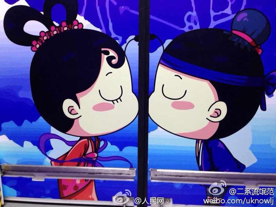 On July 15, 2014, Subway Line 1 in Hangzhou launched a series of love-themed trains ahead of the Qixi Festival featuring classic Chinese love stories including Niulang and Zhinu, Legend of the White Snake, and the Butterfly Lovers, often regarded as the Chinese equivalent of Romeo and Juliet. It is estimated that a love train arrives at a station along the line every 30 minutes. This year the Qixi Festival, also known as the Chinese Valentine’s Day, falls on August 2.(Photo/Weibo)