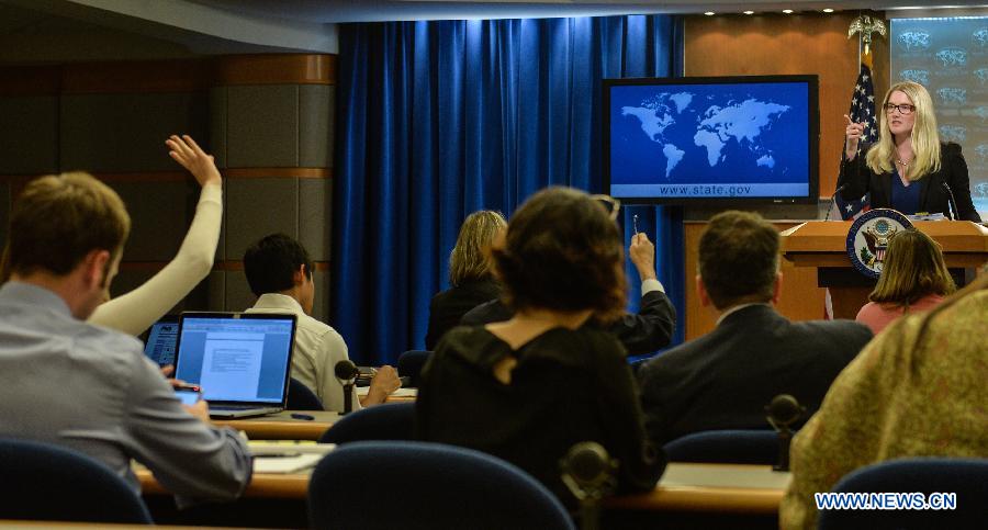 U.S. State Department spokeswoman Marie Harf speaks during daily press briefing in Washington D.C., capital of the United States, July 21, 2014. U.S. President Barack Obama on Monday called for a full, unimpeded and transparent investigation into the crash of Malaysian airliner MH17 in Ukraine. (Xinhua/Bao Dandan)
