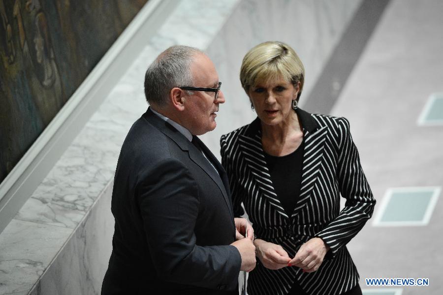Dutch Foreign Minister Frans Timmermans (L) speaks with his Australian counterpart Julie Bishop before a United Nations Security Council meeting regarding the Malaysian Airlines MH17 crash, at the UN headquarters in New York, on July 21, 2014. The UN Security Council on Monday approved a resolution demanding safe and unrestricted access to the MH17 crash site, and calling for full cooperation with the international investigation. (Xinhua/Niu Xiaolei)