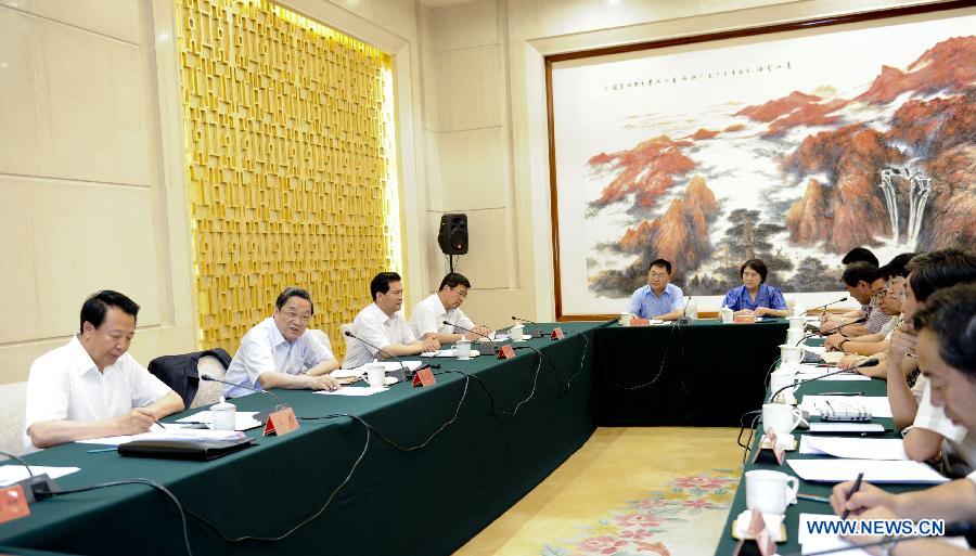 | Yu Zhengsheng (2nd L), chairman of the National Committee of the Chinese People's Political Consultative Conference (CPPCC), holds a meeting with specialists and scholars in Hohhot, capital of north China's Inner Mongolia Autonomous Region, July 20, 2014. Yu made an inspection tour in Inner Mongolia from July 18 to 21. (Xinhua/Zhang Duo) |