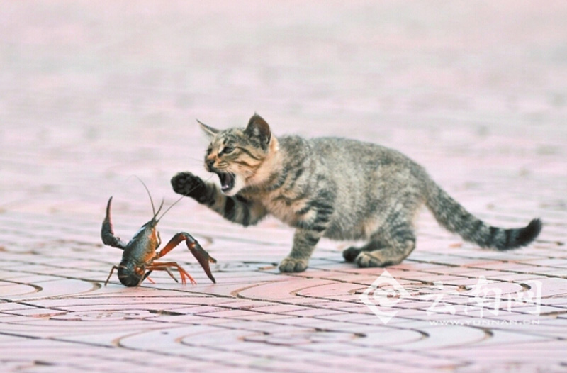 A fight between a lobster and three cats recently took place on the bank of Daguan River in Kunming, southwest China’s Yunnan province. A lobster that had wandered ashore came under attack of a cat, which, failing to win on its own, hailed its buddies to join the war. But after much power wrestling, the besieged lobster managed to escape the claws and jaws of the cats largely intact. (Photo/Yunnan.cn)
