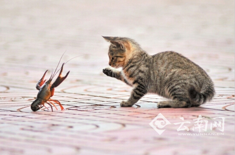 A fight between a lobster and three cats recently took place on the bank of Daguan River in Kunming, southwest China’s Yunnan province. A lobster that had wandered ashore came under attack of a cat, which, failing to win on its own, hailed its buddies to join the war. But after much power wrestling, the besieged lobster managed to escape the claws and jaws of the cats largely intact. (Photo/Yunnan.cn)