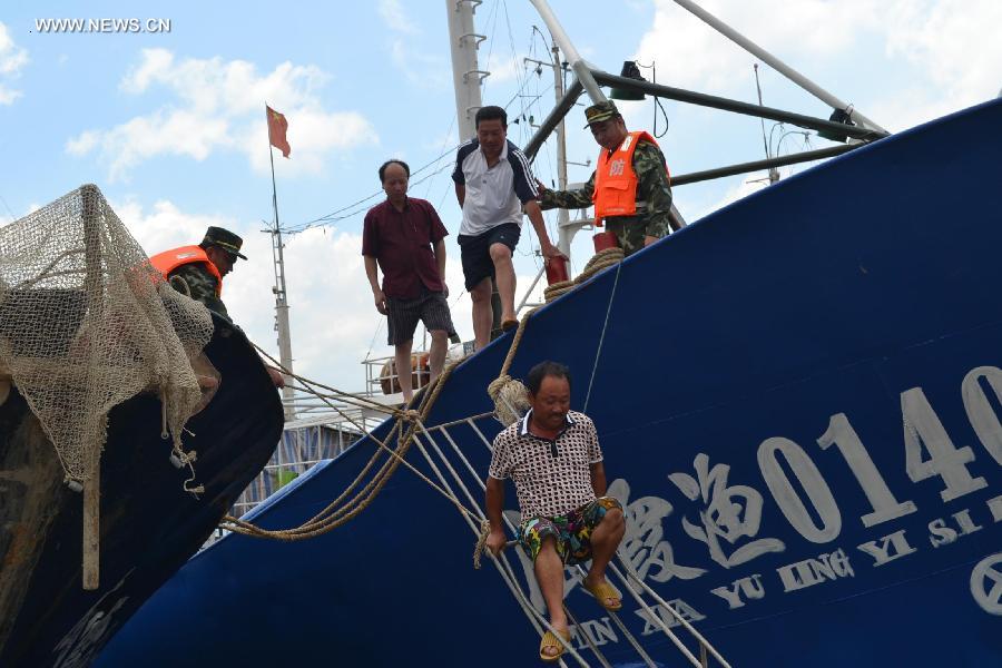Border policemen transfer fishermen to a shelter at the Shacheng port in Diantou Town of Fuding City, southeast China's Fujian Province, July 22, 2014. Typhoon Matmo, the 10th typhoon to affect China this year, was approaching China's southeast coast on Tuesday. (Xinhua/Yuan Ziyou)
