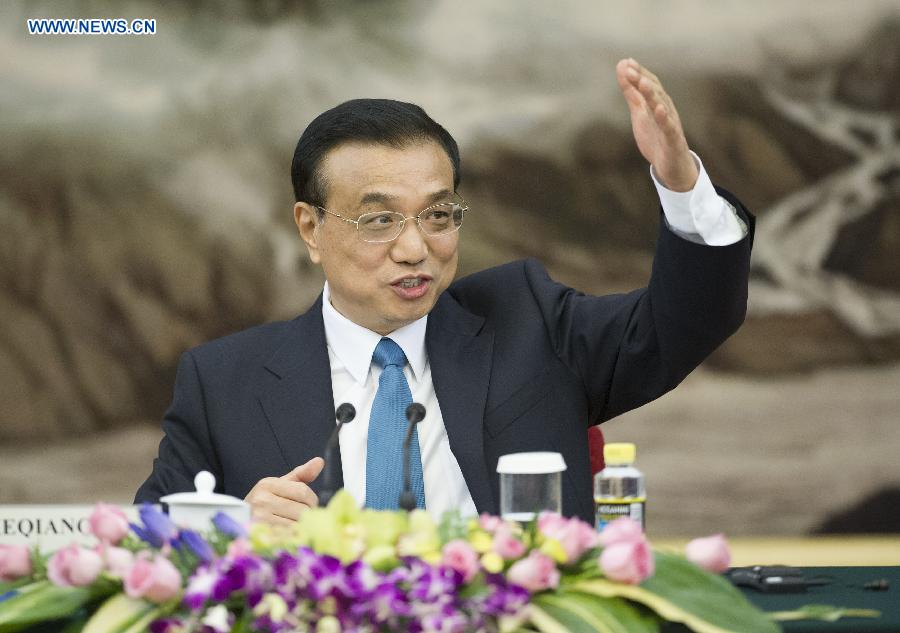 Chinese Premier Li Keqiang speaks in a meeting with a delegation of U.S. business leaders and former senior officials, who are here for the sixth round of dialogues between China-U.S. business leaders and former senior officials, in Beijing, capital of China, July 22, 2014. (Xinhua/Huang Jingwen)