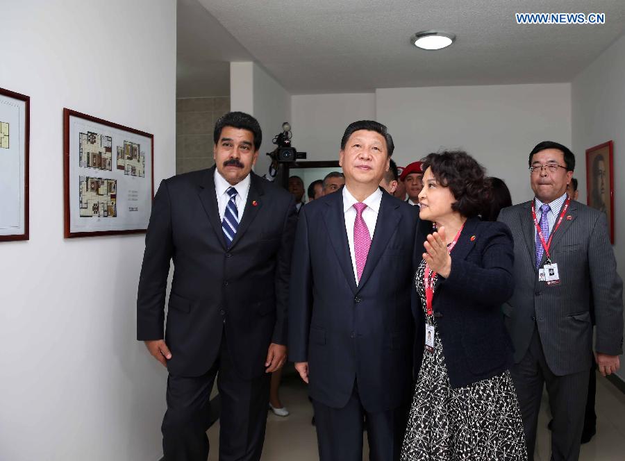 Chinese President Xi Jinping (C), accompanied by his Venezuelan counterpart Nicolas Maduro (L), visits a housing project in Caracas, capital of Venezuela, July 21, 2014. (Xinhua/Lan Hongguang)