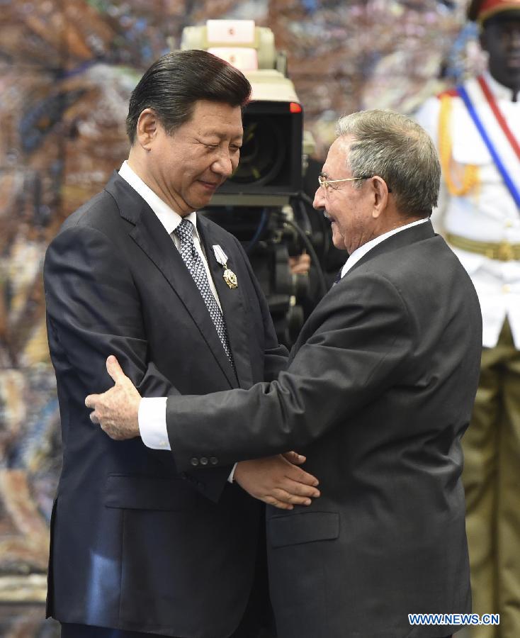 Chinese President Xi Jinping (L) is awarded Cuba's Jose Marti Medal by Cuban President Raul Castro in Havana, capital of Cuba, July 22, 2014. (Xinhua/Ma Zhancheng)
