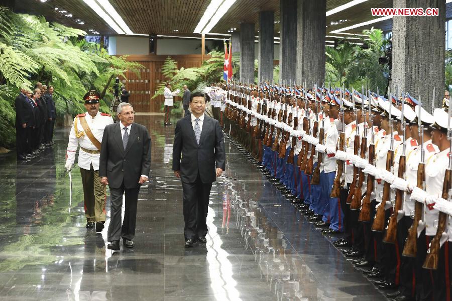 | Chinese President Xi Jinping (C) attends a welcoming ceremony held by Cuban President Raul Castro (1st L Front) in Havana, capital of Cuba, July 22, 2014. (Xinhua/Ding Lin) |