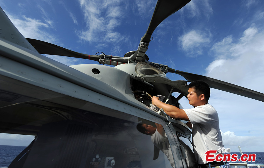 China's ship-borne helicopter is seen during the Rim of the Pacific (RIMPAC) multinational naval drill. China's navy exchanges copter landing experiences with other participating countries in the drill. [Photo: China News Service / Mao Jianjun]