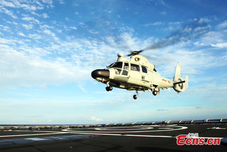 China's ship-borne helicopter is seen during the Rim of the Pacific (RIMPAC) multinational naval drill. China's navy exchanges copter landing experiences with other participating countries in the drill. [Photo: China News Service / Mao Jianjun]