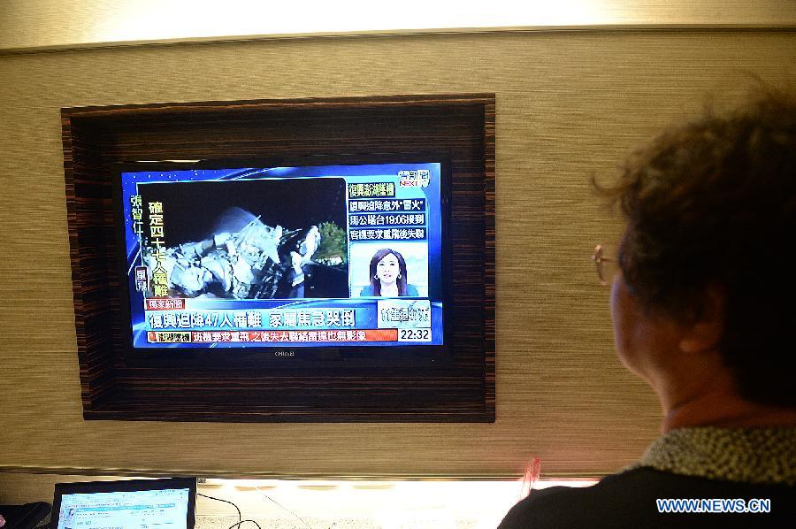 A woman watches TV reporting on an emergency landing of an ATR-72 airliner of Taiwan's TransAsia Airways in Taipei, southeast China's Taiwan, July 23, 2014. An ATR-72 airliner which carried 54 passengers and four crew members was flying from Kaohsiung to Penghu, where it made an emergency landing, on Wednesday. (Xinhua/He Junchang)