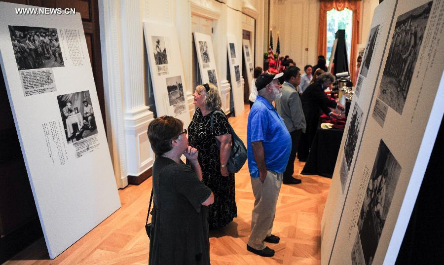 People visit the photo exhibition "Salute to Friendship - Images Narrate China-U.S. Collaboration During World War II" at the Nixon Library in Yorba Linda City of California, the United States, July 23, 2014. The photos were taken by soldiers of the U.S. Army Signal Corps in China during WWII. (Xinhua/Zhang Chaoqun)