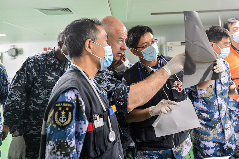 Medical officers from US Military Sealift Command hospital ship USNS Mercy and Chinese hospital ship Peace Ark on July 17, 2014. (Photo/Xinhua)