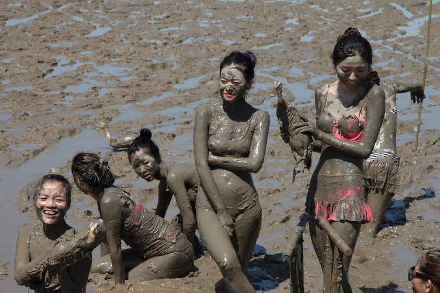 On July 22, 2014, thirty contestants to Miss Tourism China play in sea mud at the "Sea Mud Carnival" held in Xiushan, Zhoushan, Zhejiang province, attracting a largest number of tourists from Shanghai, Hangzhou, Suzhou and other cities. (Photo/youth.cn)