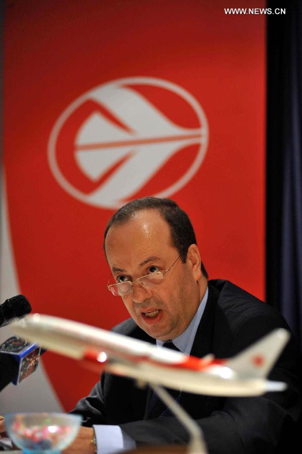 This file photo taken on on July 6, 2011, shows CEO of Algerian national airline company Air Algerie, Mohamed Salah Boultif speaks during a press conference in Algiers, capital of Algeria. Air Algerie said on Thursday that it lost contact with a plane 50 minutes after the aircraft took off from Ouagadougou, capital of Burkina Faso, en route to Algiers. (Xinhua/Mohamed Kadri)