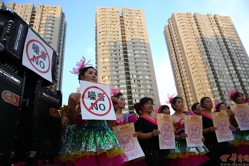 More than 1,000 Chinese damas attending Weiyang District square dancing final issuing proposal to control the timing and sound of square dance in Xi'an city on July 22, 2014. Holding placards reading "No Noise", they vowed to practice square dance from 7 a.m. to 9 p.m. only and to keep the sound down to 60 decibels. The square dance – a favorite of Chinese damas - can be seen everywhere in China. "Chinese dama", a group consisting mainly of married women between 40 and 60, grabbed the attention of the public for the first time in 2013. (Photo/HSW.CB)
