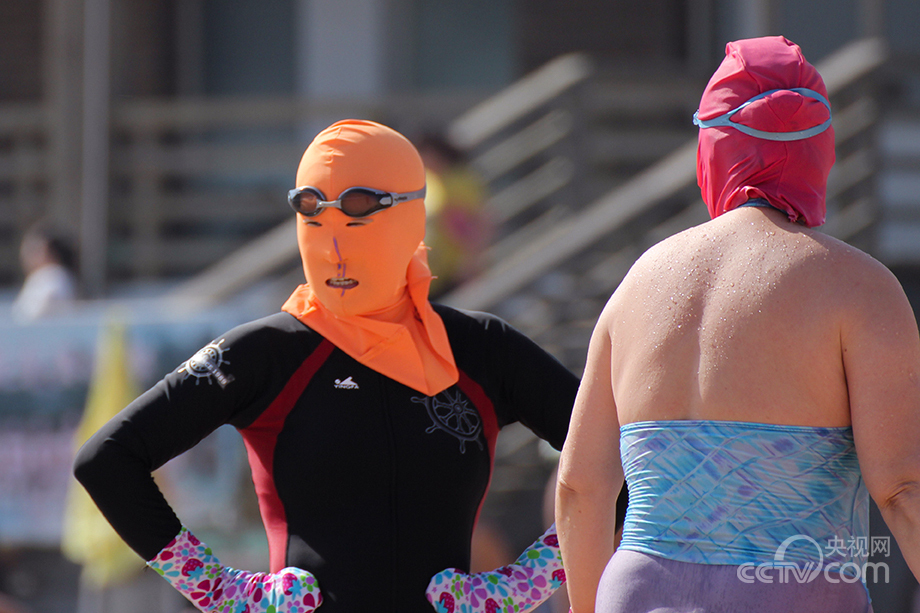 Women wearing facekini spend holidays on the beach of Qingdao in east China's Shandong province on May 26, 2014. Facekini is a skin mask designed for swimmers and beachgoers which covers the head and reveals only the eyes, nose, and mouth. This mask is popular in the Chinese city of Qingdao, where it is used by people for protecting themselves from UV rays while tanning and from jellyfish while at the beach.(Photo/CNTV)