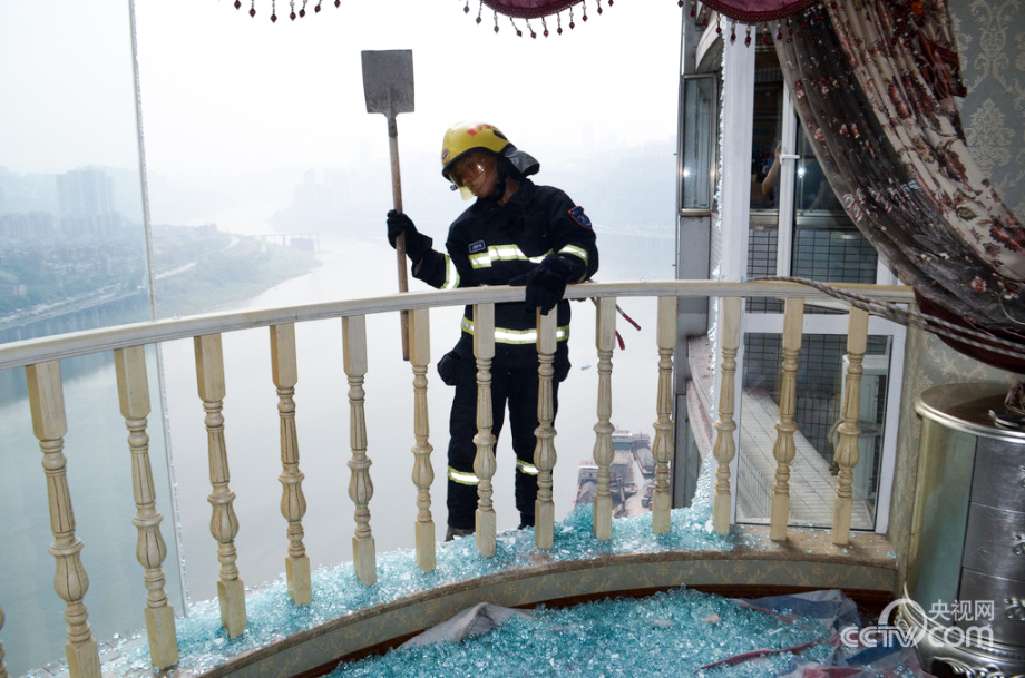 A fireman cleans up the broken glass of a window in Shapingba district in southwest China's Chongqing on July 10, 2014. Due to continued high temperatures, the windowpane of a home exploded, leaving a large hole in the middle.(Photo/CNTV)