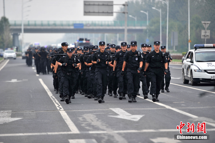 On July 24, Beijing Public Security Bureau holds anti-terrorism exercise to further test and improve the anti-terrorism capabilities. Police helicopters were used in the drill to transmit images. (CNS Photo)