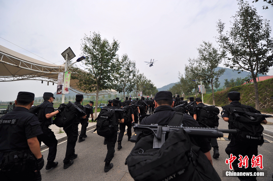 On July 24, Beijing Public Security Bureau holds anti-terrorism exercise to further test and improve the anti-terrorism capabilities. Police helicopters were used in the drill to transmit images. (CNS Photo)