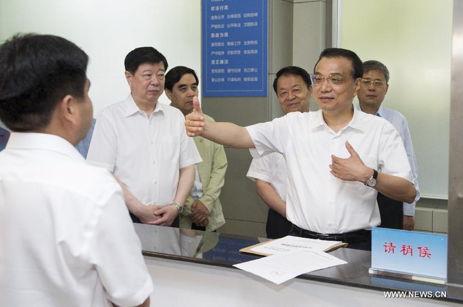 | Chinese Premier Li Keqiang (2nd R) talks to a staff member at a service window of the provincial department of transportation in Jinan, capital of east China's Shandong Province, July 25, 2014. Li had an inspection tour in Shandong from July 24 to 25. (Xinhua/Huang Jingwen) |