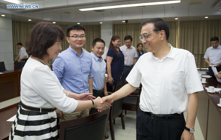 Chinese Premier Li Keqiang (R front) shakes hands with an entrepreneur after a symposium with heads of some newly-registered enterprises in Jinan, capital of east China's Shandong Province, July 25, 2014. (Xinhua/Huang Jingwen)