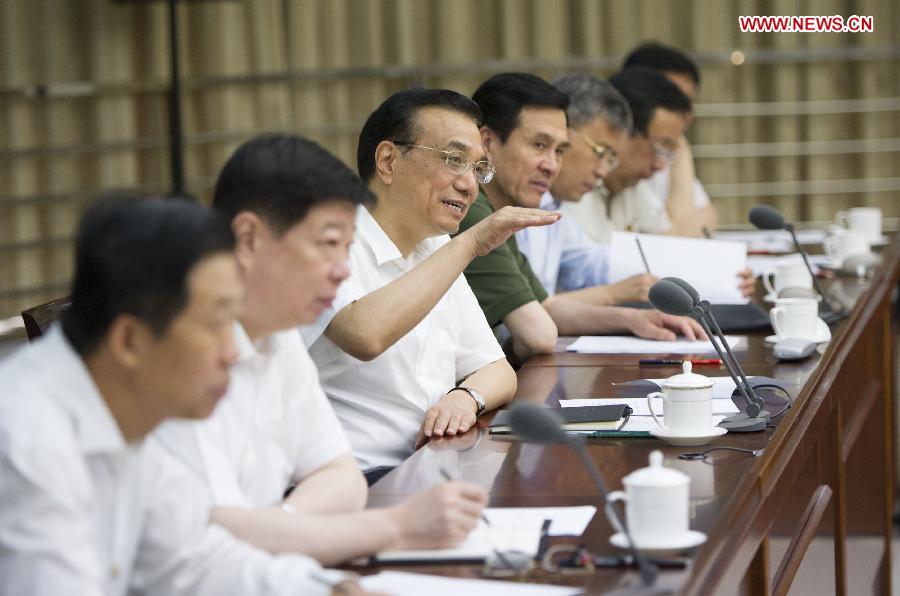 Chinese Premier Li Keqiang (3rd L) attends a symposium with heads of some newly-registered enterprises in Jinan, capital of east China's Shandong Province, July 25, 2014. (Xinhua/Huang Jingwen)