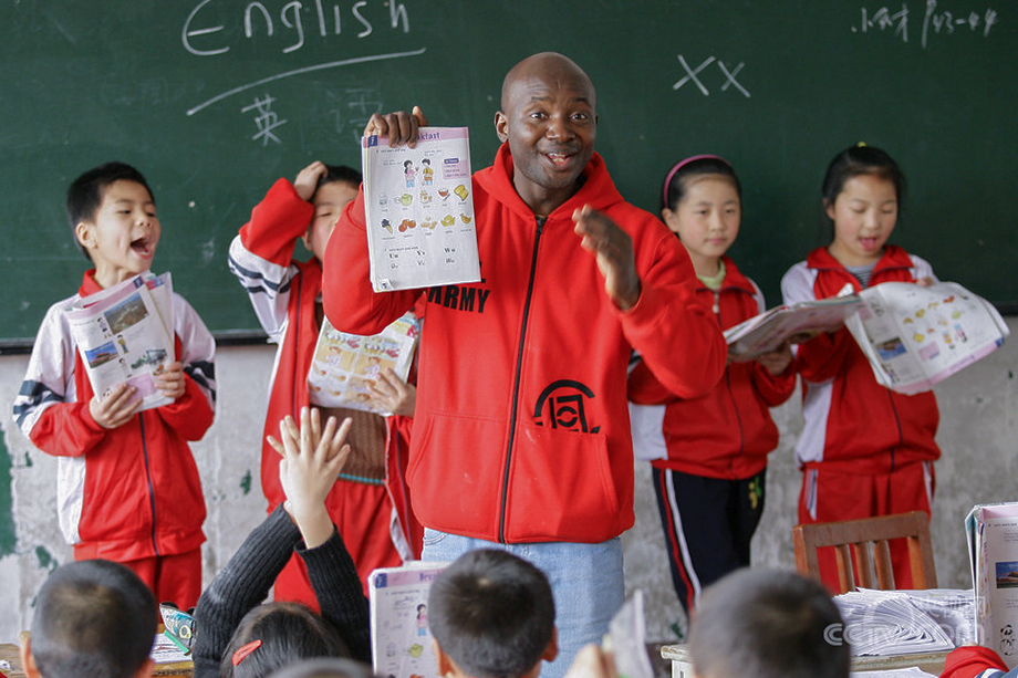 A Nigerian student from Central China Normal University gives lessons to the children of migrant workers in Chunmiao Primary school in Wuhan, central China's Hubei province on April 16, 2012. He has been a volunteer teacher in the primary school for two years. (Photo/CNTV)