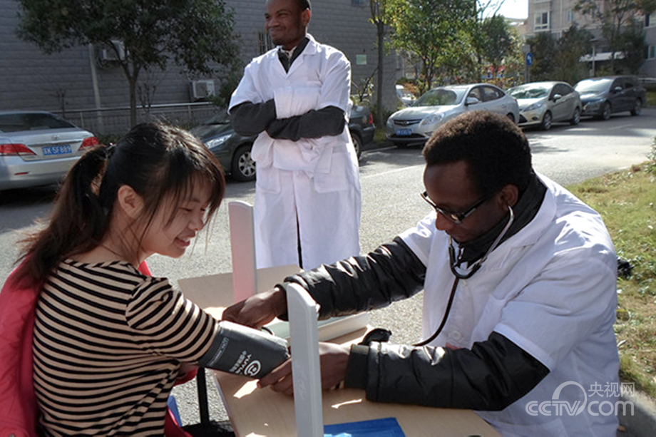 | Two foreign students - Morris from Kenya and Gilson Namibia - provide medical service to the residents in Yanchi community of Yangzhou, east China's Jiangsu province on Nov. 4, 2012. (Photo/CNTV) |
