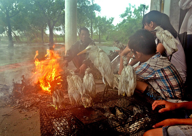 After Fu Feiwu lights up firewood, some herons rush to it for warmth. An hour later, more herons could stand up. (Photo/ Deng Bo)