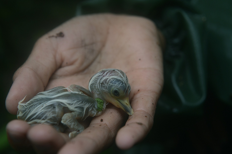 A newborn heron is blown out of its nest by the strong storm, shivering. (Photo/ Deng Bo)