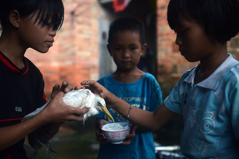 Villagers feed the rescued herons with rice. (Photo/ Deng Bo)