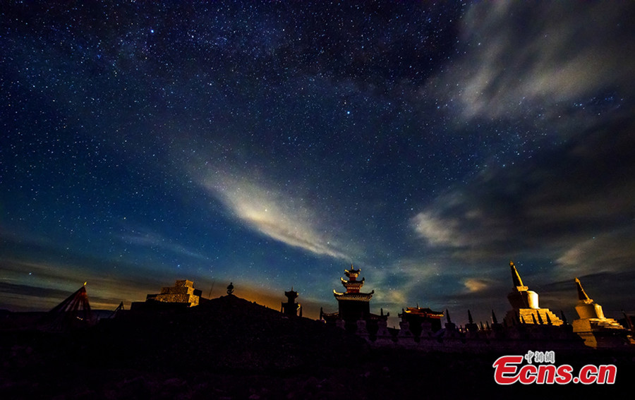 Photo shows night scenery of pagoda forests under starry sky at Waqie township of Hongyuan county in Aba Tibetan and Qiang autonomous prefecture, southwest China's Sichuan province. [Photo/Deng Chonggang]