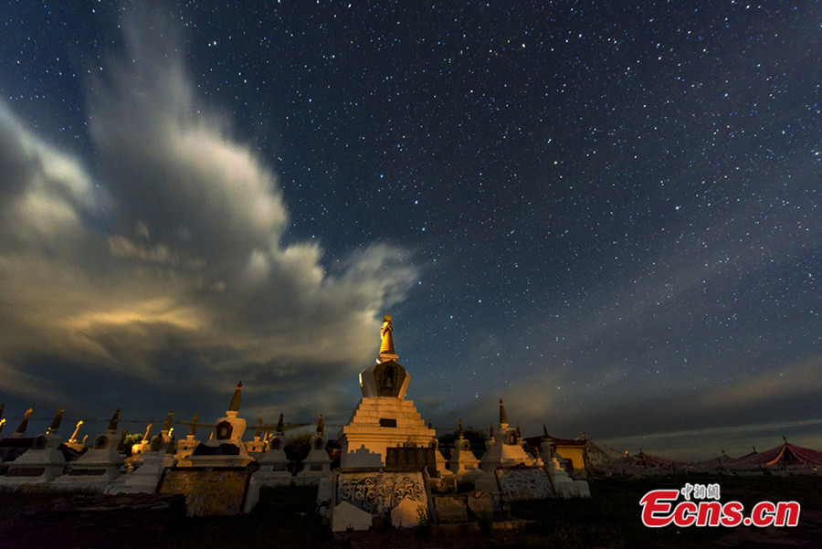 Photo shows night scenery of pagoda forests under starry sky at Waqie township of Hongyuan county in Aba Tibetan and Qiang autonomous prefecture, southwest China's Sichuan province. [Photo/Deng Chonggang]