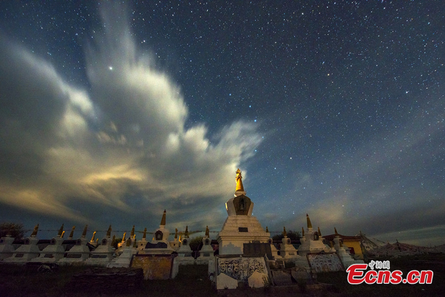 Photo shows night scenery of pagoda forests under starry sky at Waqie township of Hongyuan county in Aba Tibetan and Qiang autonomous prefecture, southwest China's Sichuan province. [Photo/Deng Chonggang]