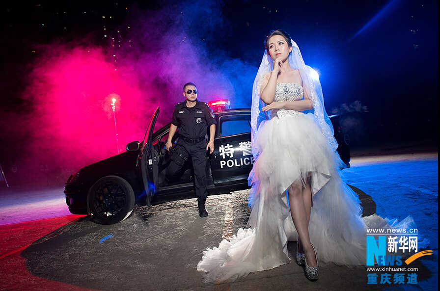 A member of the Chongqing Armed Police Corpssnapped some rather incredible wedding photos with his bride-to-be at a SWAT training center. (Photo/Xinhua News Agency)
