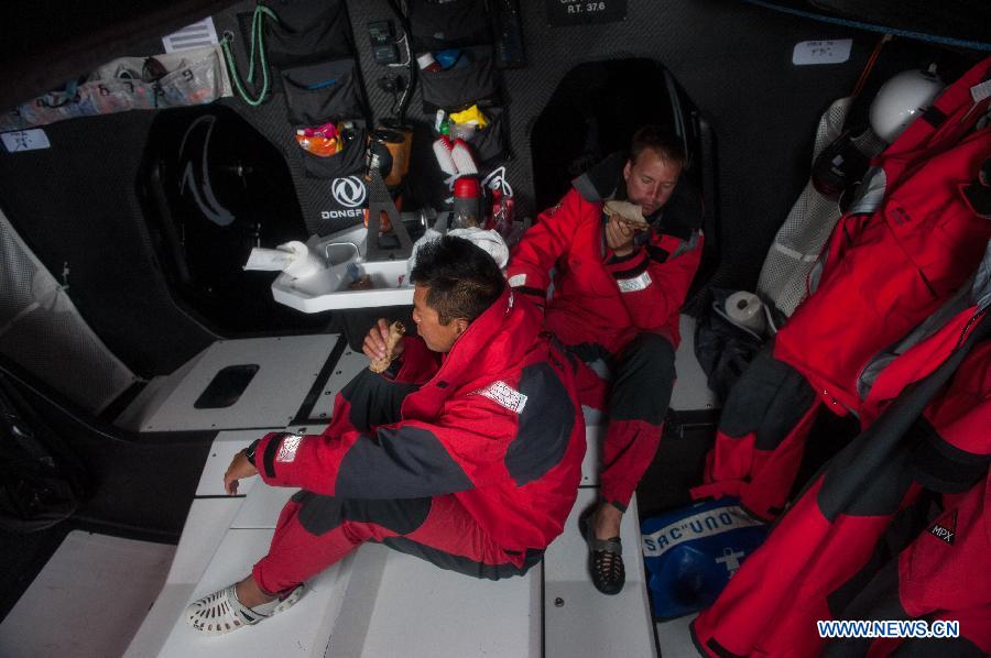 Chen Jinhao (L) and Martin Stromberg have breakfast and take a break during the offshore training in the Bay of Biscay, western France, on July 4, 2014. The China's Dongfeng Team prepares for Volvo Ocean Race 2014-2015 starting from Alicante of Spain in October, and it will last for nearly 9 months with 10 legs of competition over almost 39000 nautical miles (72000 km) around the world until it ends in Gothenburg of Sweden in June 2015. (Xinhua/Bu Duomen)