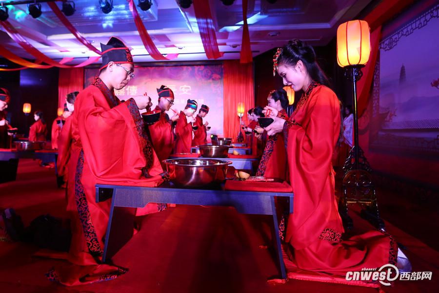 A total of 18 newlyweds attend a group wedding ceremony in Xi'an, capital of northwest China's Shaanxi province on Friday, as the "Qixi" festival approaches. They got married during the wedding wearing Han Chinese clothing, the costume of Han People in China, for the traditional service. "Qixi", marked on the seventh day of the seventh lunar month,is a traditional festival regarded as the Chinese Valentine's Day. (Cnwest Photo)