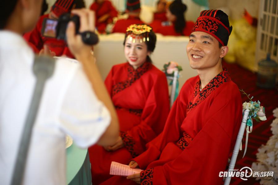 A total of 18 newlyweds attend a group wedding ceremony in Xi'an, capital of northwest China's Shaanxi province on Friday, as the "Qixi" festival approaches. They got married during the wedding wearing Han Chinese clothing, the costume of Han People in China, for the traditional service. "Qixi", marked on the seventh day of the seventh lunar month,is a traditional festival regarded as the Chinese Valentine's Day. (Cnwest Photo)