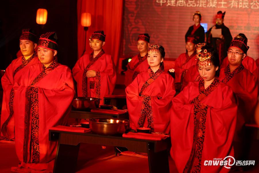A total of 18 newlyweds attend a group wedding ceremony in Xi'an, capital of northwest China's Shaanxi province on Friday, as the "Qixi" festival approaches. They got married during the wedding wearing Han Chinese clothing, the costume of Han People in China, for the traditional service. "Qixi", marked on the seventh day of the seventh lunar month,is a traditional festival regarded as the Chinese Valentine's Day. (Cnwest Photo)