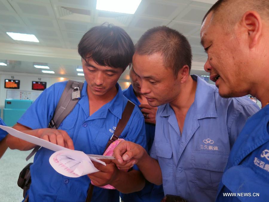 Chinese employees of a steel plant check a name list at the Carthage Airport in Tunis, Tunisia, Aug. 1, 2014. 121 Chinese nationals, who had been evacuated from violence-hit Libya, reached Tunisia early Friday, the Chinese Embassy said. They traveled to the Tunisian capital, from where they would be flown home. (Xinhua/Pan Xiaojing)